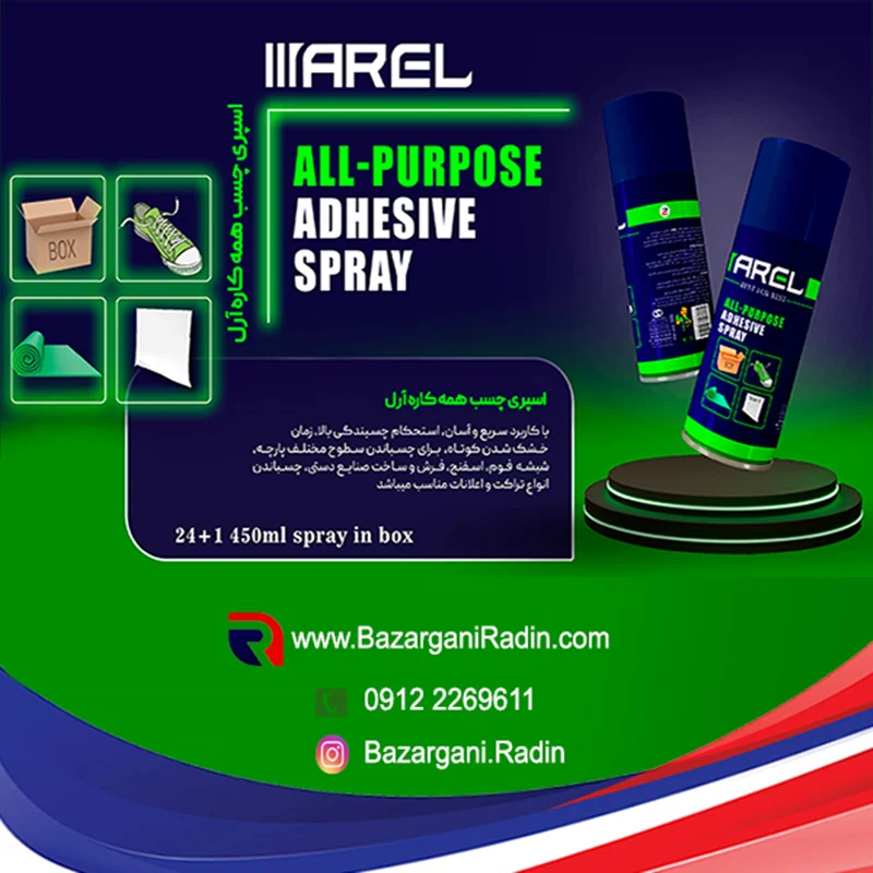 اسپری چسب همه کاره آرل 450 میل (AREL) . برای چسباندن کاغذ ،پلاستیک ، پارچه فلز، فوم ،شیشه،اعلامیه استفاده میشود. بخصوص جهت تهیه کاردستی توسط فرزندان محصل و کارهای هنری(بدون نیاز به چسب مایع ، و بدون خطر چسبیدن چسب به دست کودکان) همچنین از این اسپری چسب همه کاره میتوان برای چسباندن اعلامیه و تراکت به سطوح مختلف استفاده کرد