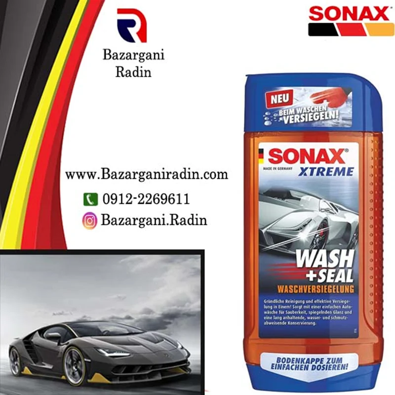 محصول فوق شامپو محافظ بدنه و آبگریز اکستریم سوناکس مخصوص رنگ بدنه500 میل(SONAX)کد244200 می باشد ، که توسط شرکت سوناکس (SONAX) آلمان تولید میشود.02442000 SONAX XTREME Wash+Seal یک محصول فوق العاده در زمینه شستشوی بدنه میباشد. این محصول دارای کاربرد براق کننده , تمیز کننده , محافظت کننده و حجمی برابر 500میل میباشد. .شامپو محافظ بدنه و آبگریز اکستریم سوناکس با غلظت و قدرت پاک کنندگی زياد برای شستشوی دستی اتومبيل کاربرد دارد. این محصول جرم های ناشی از آلودگی جاده و محيط را به سرعت و به آسانی از سطح رنگ پاک می کند. به اندازه نصف درب محصول ( 25 میلی لیتر) از شامپو را با 10 لیتر آب گرم ترکیب نمایید.